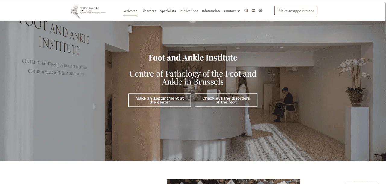 Site vitrine multilingue avec gestion de dizaines de publications médicales et une carte anatomique interactive du pied — chaque point douloureux indiqué renvoyant vers la pathologie correspondante.