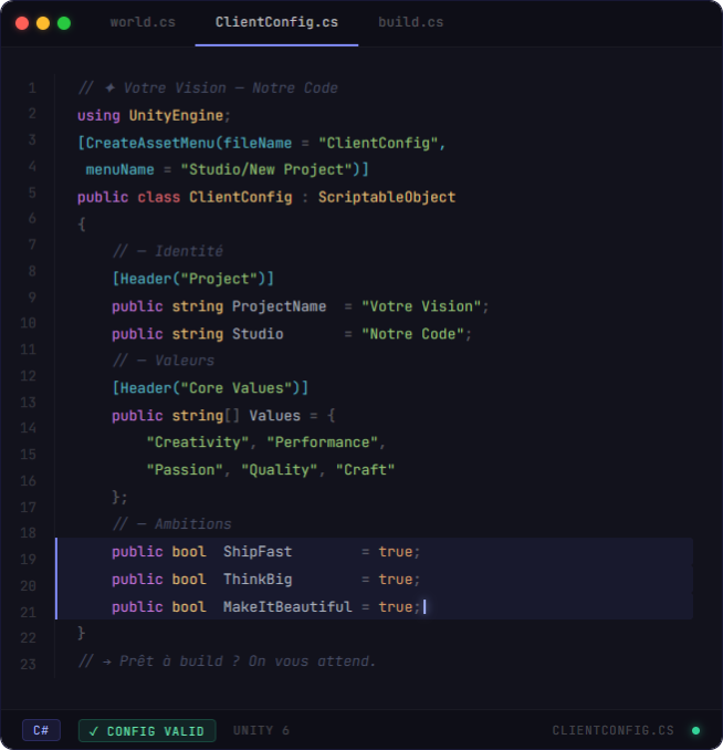 Conception et développement de jeux et applications sur mesure avec Unity3D, de l’idée au build final sur tous supports.